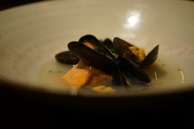 八海山サーモンのソティーとモンサンミッシェル産ムール貝の一皿