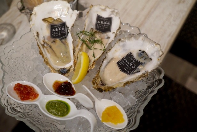 殻付きフレッシュオイスター、3銘柄食べ比べ 4種のソースを添えて(1,400円)