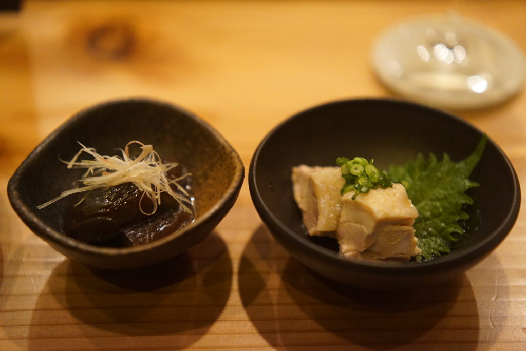 すぐに茄子のオランダ煮&蒸し鶏のゆずポン酢が出てきて、つまみながらお酒が飲めて幸せに。
