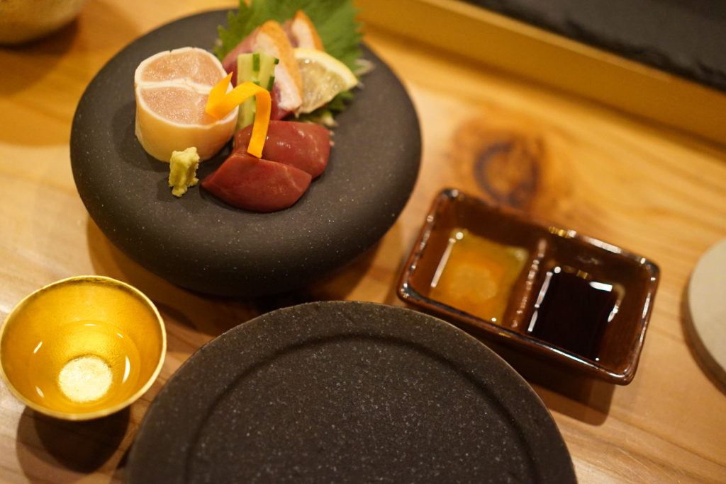 このお店で1番印象に残ったのが、こちらの「鶏刺し三種盛り」