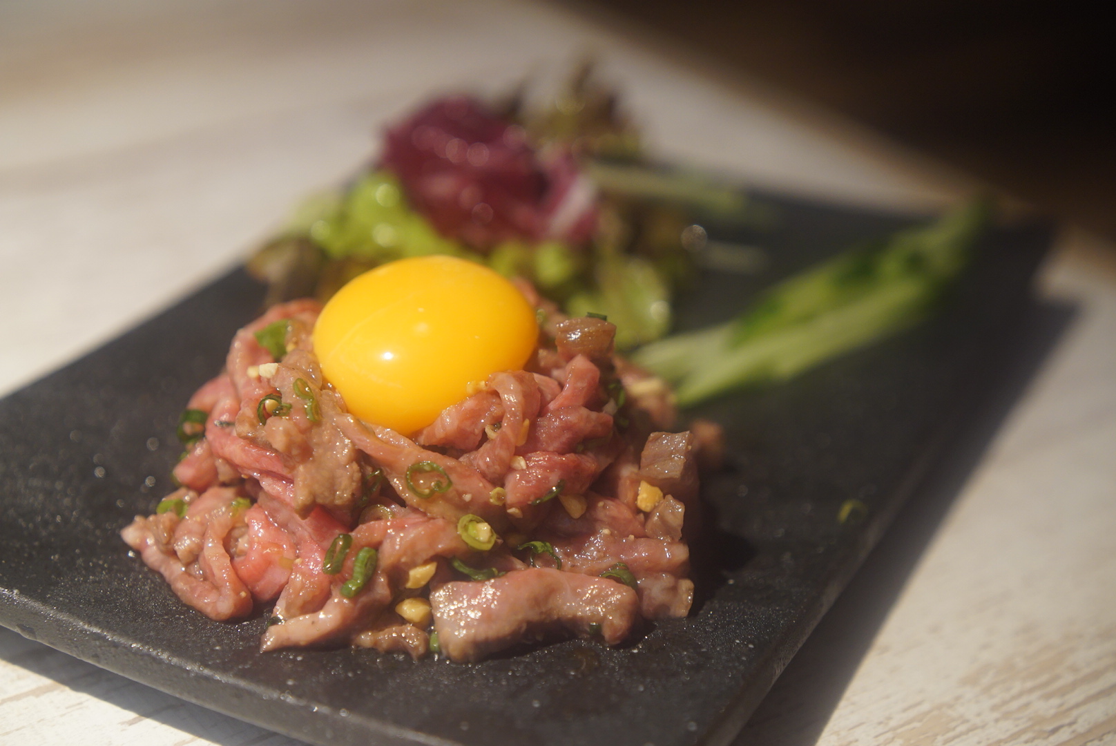 生肉を食べたくてユッケをオーダー。焼肉に行ったらやっぱり頼んじゃいます。