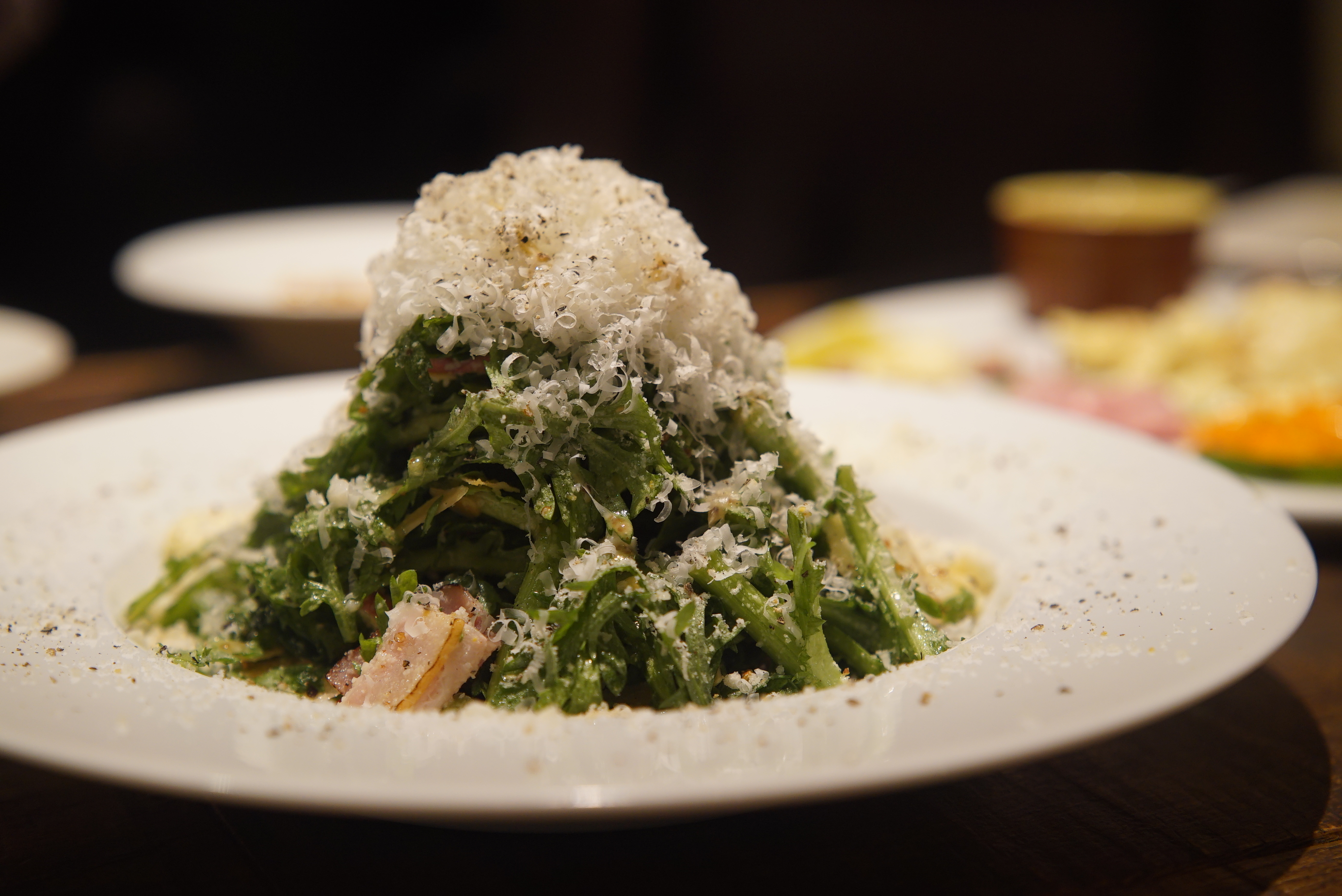 野菜も食べたくてオーダーしたのが、チーズたっぷり、春菊も苦みがなく食べやすいサラダ!削りたてチーズにテンション上がります。