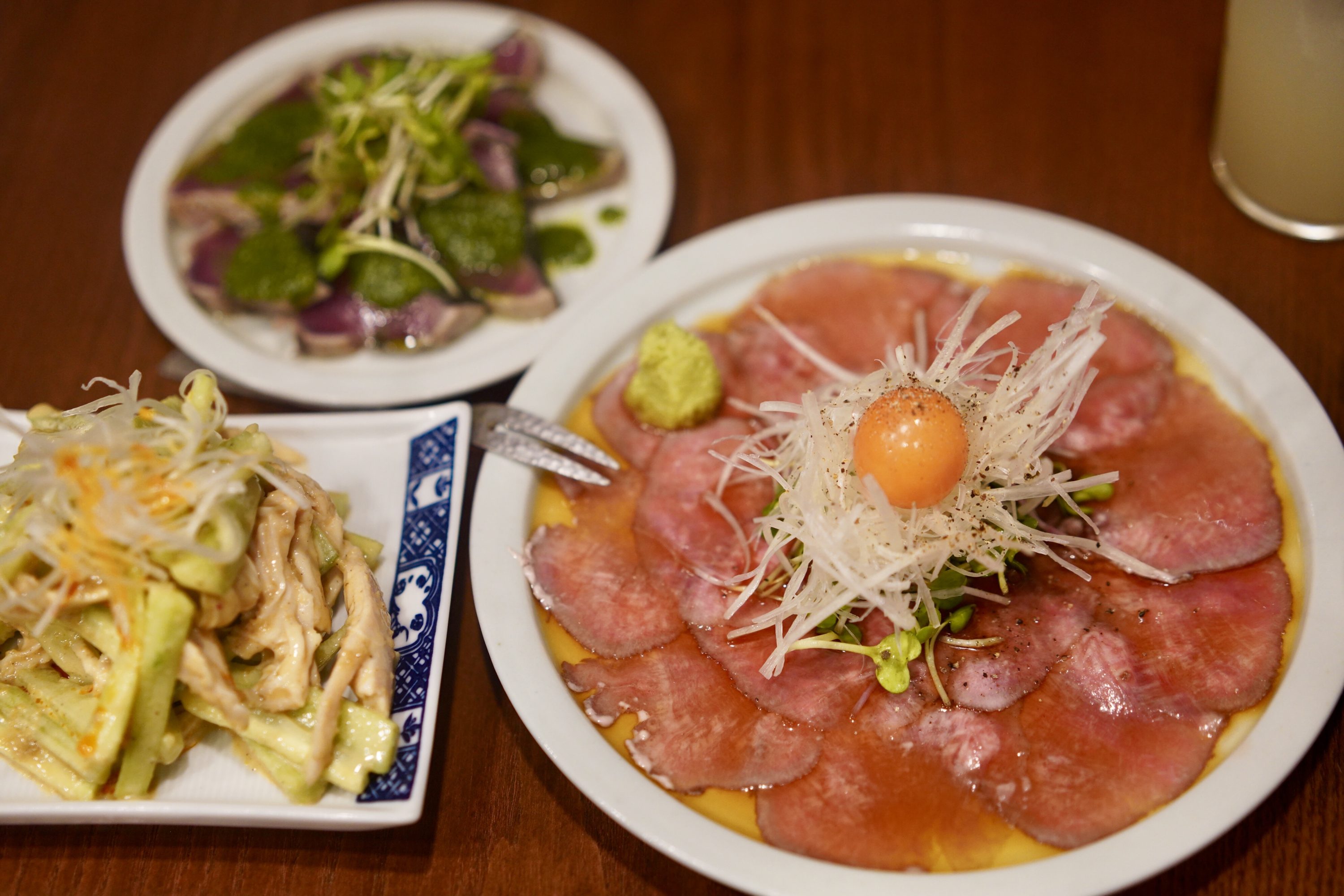 お店の方におすすめを聞いたら、薄切り牛タンのユッケ(980円)が人気商品です!ということなので、オーダーしてみたら甘めのタレと白ネギ、タンがちょうどいいバランスでおいしかった。1皿ペロリ。