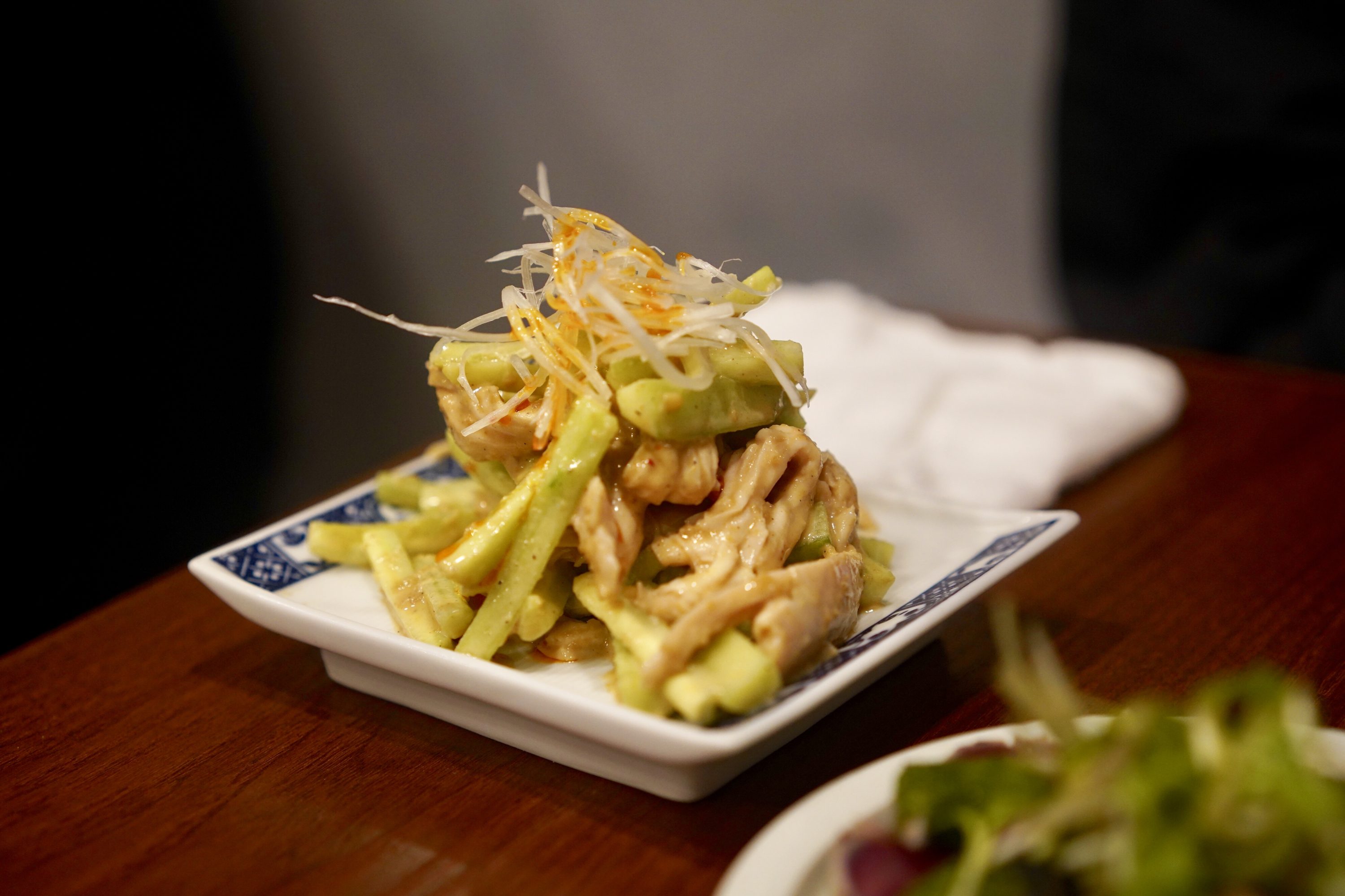 お鍋の前に簡単に何かつまみたいね、ということでバンバンジー風の蒸し鶏と胡瓜 ゴマダレ(520円)をオーダー。これがめちゃくちゃいいチョイスでごまだれの濃さといい、キュウリと鶏のバランスが最高!