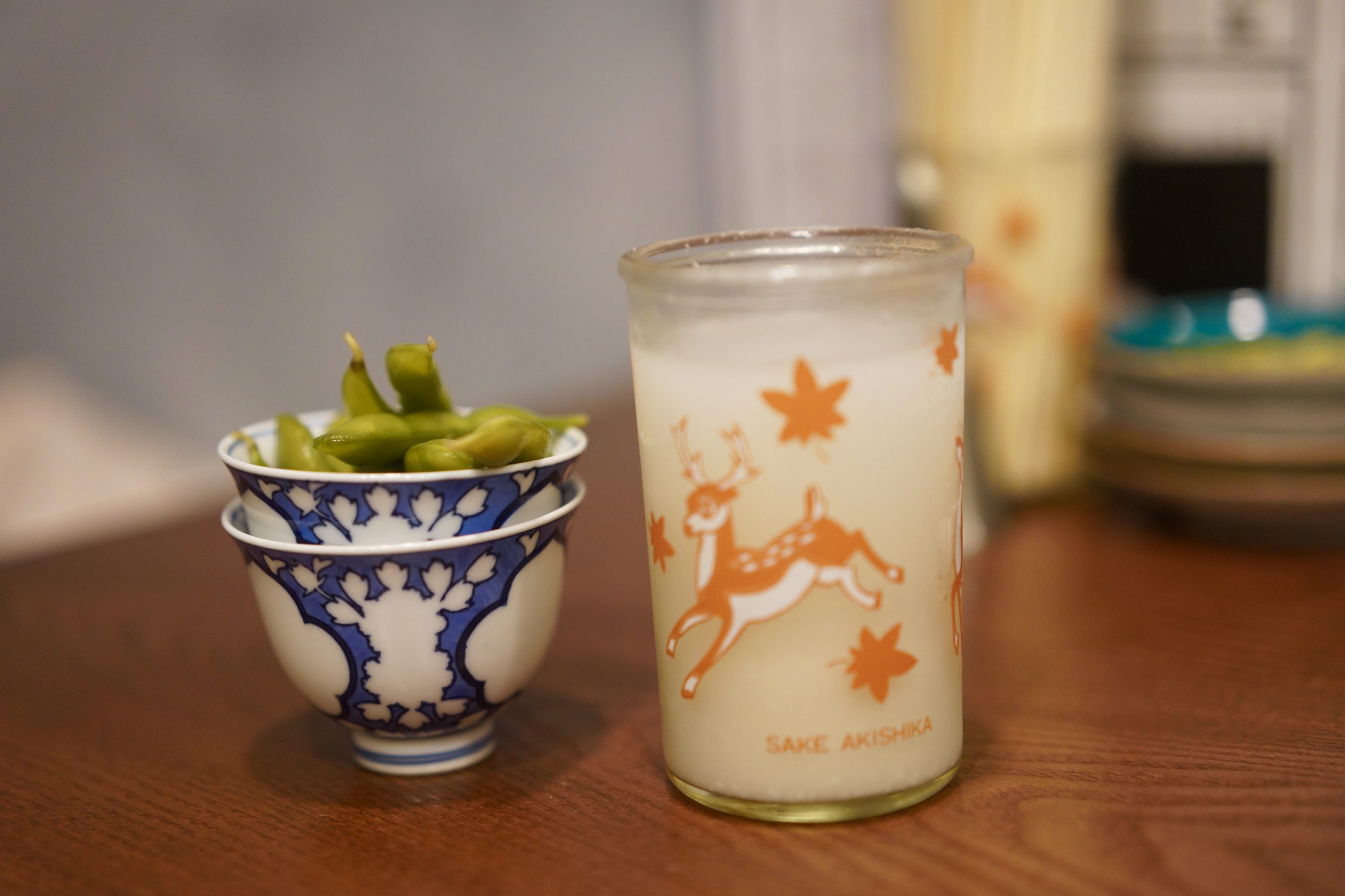 お通しは少し甘めの枝豆。器好きにはたまらない、おちょこのような器にて出てきました。