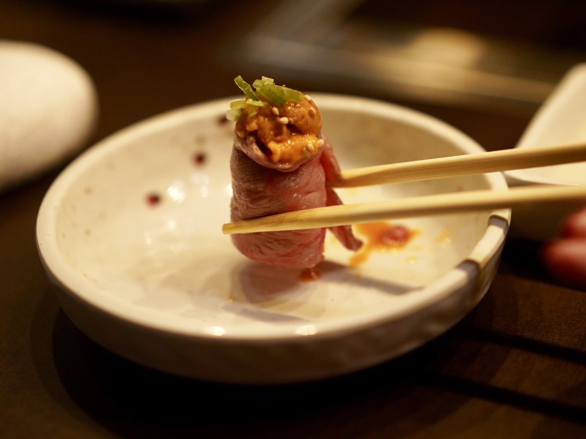 うにがたっぷり入った肉巻き軍艦を一口で頬張る幸せ♡生きててよかったー!