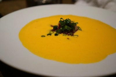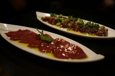 ぶつ切りにした生の馬肉を、泡立てた卵黄ソースと