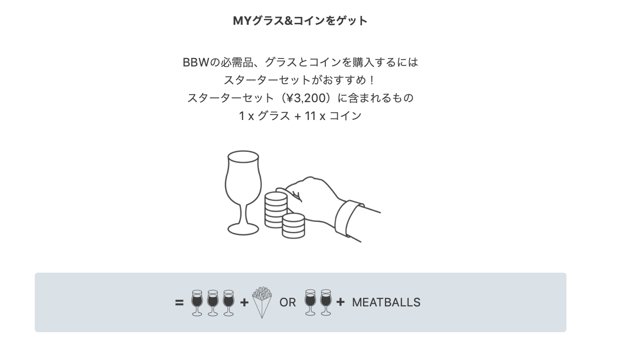 ベルギービールウィークエンドは入場料は無料なのですが、ビールを楽しむには「スターターセット(3200円)」の購入がベストです。ちょっとだけしか飲まない…という方には、オリジナルグラス(880円)にコイン3枚(220×3=660円)で1540円〜で楽しめます。
