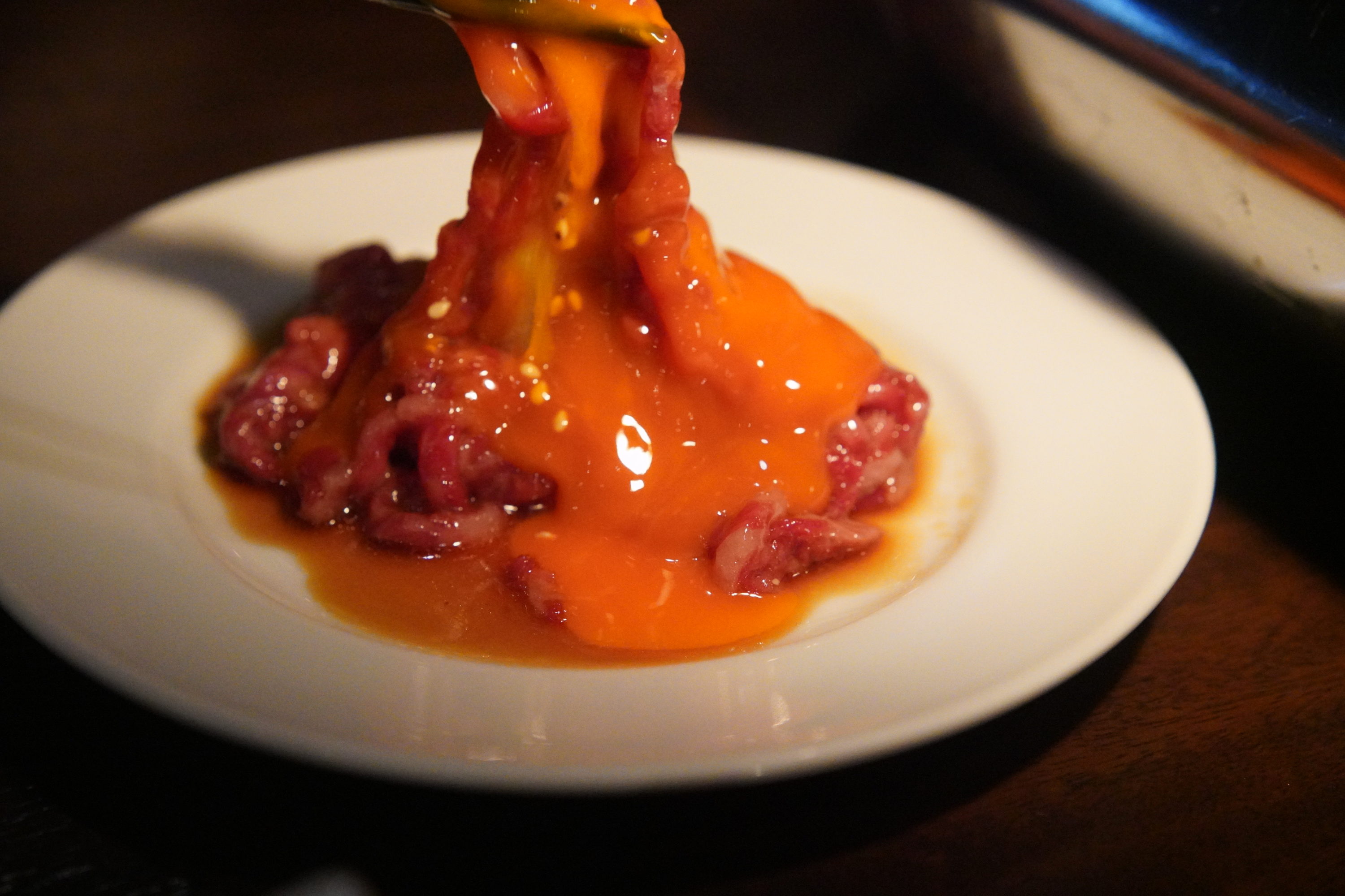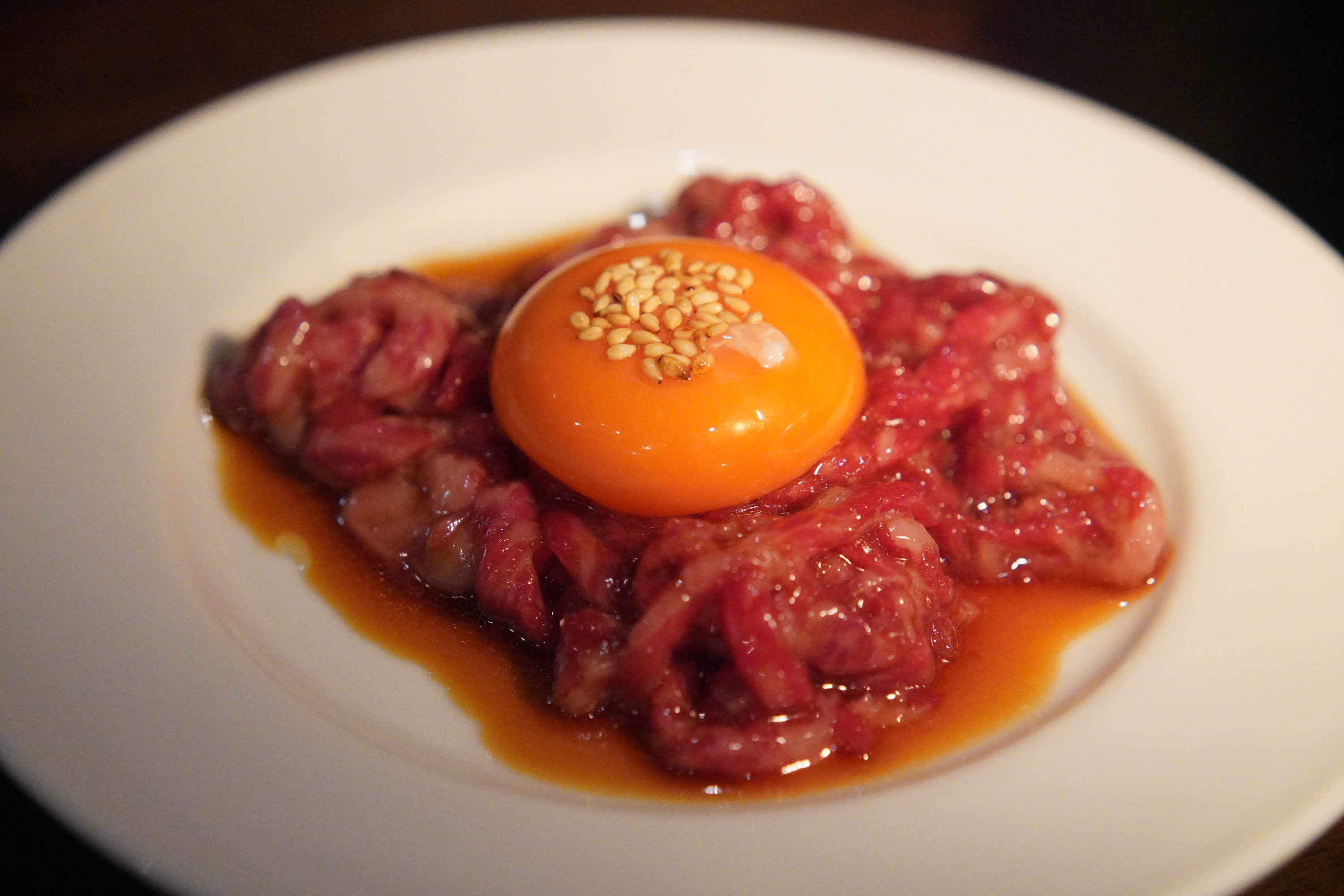 名物の「黒毛和牛のユッケ」は黄身を崩していただきます。