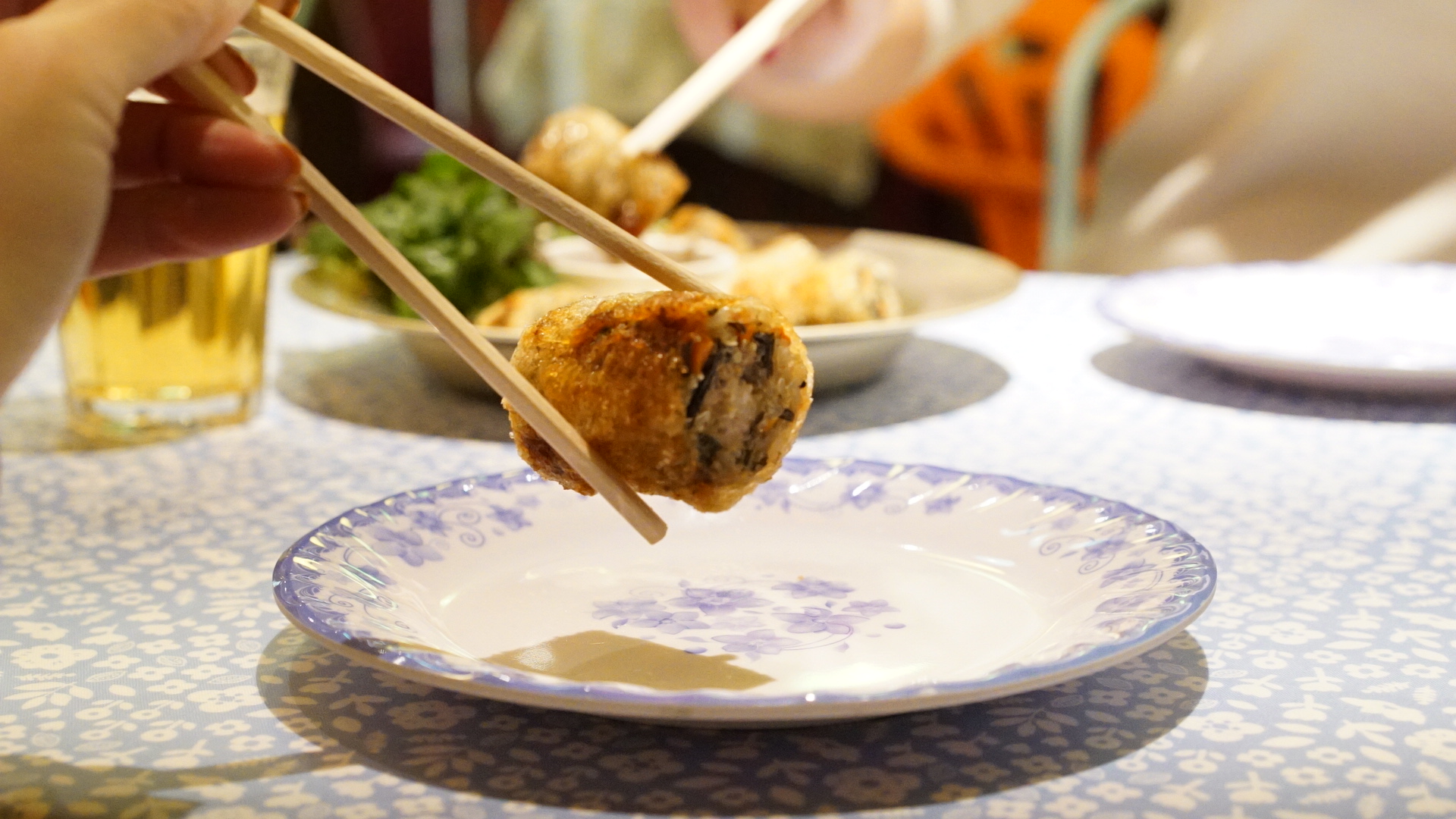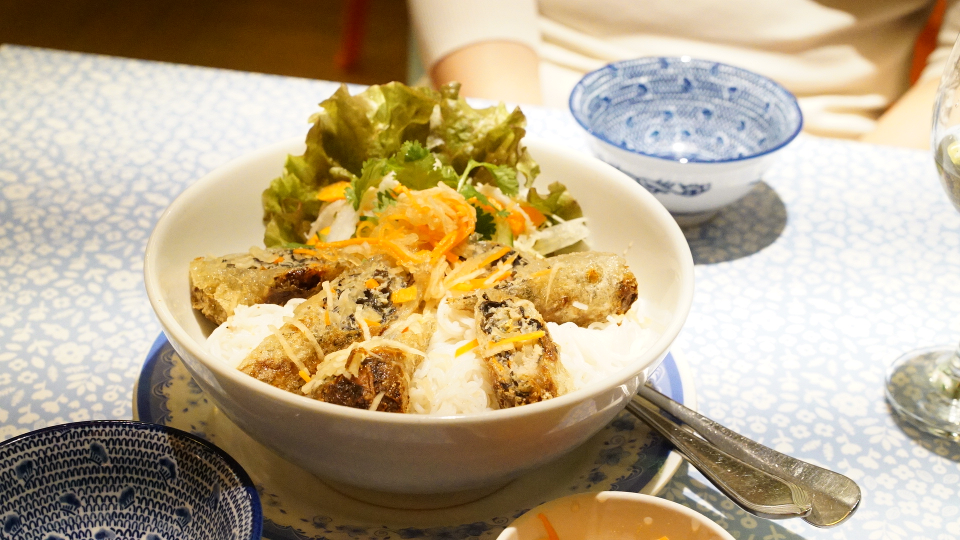 シメは、揚げ春巻きが入ったブンチャ(1,080円)にしてみました。スイートチリソースと一緒にいただきます。この麺の感じがザ・ベトナム。カリカリの揚げ春巻きも単品でオーダーしたのにいくらでも食べられます。