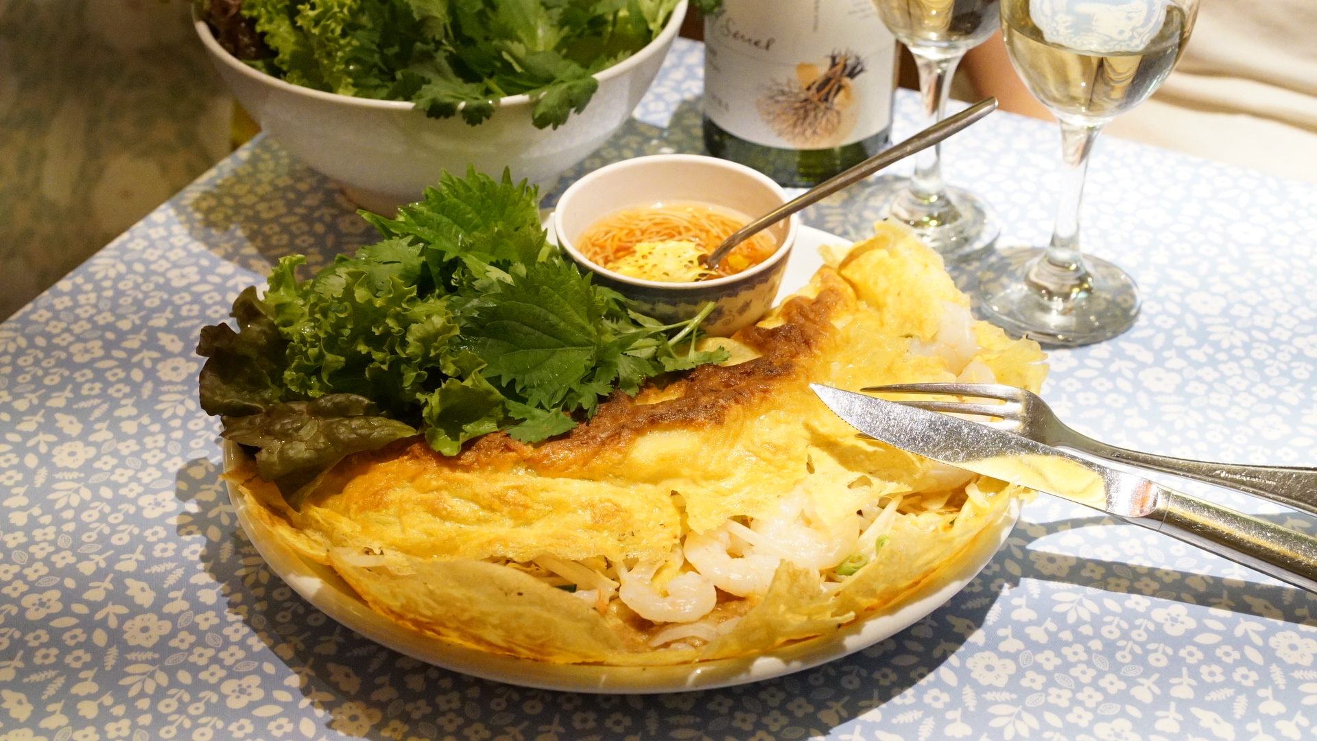 ベトナム風お好み焼きともいえる バインセオ(1,750円) はパリパリさくさくで野菜に包んでもぐもぐ。追加野菜の まきまき野菜ボウル(770円)をオーダーして普段の野菜不足を補いました。バインセオはパリパリ、サクサクで美味しかったのでぜひオーダーしてみてください。