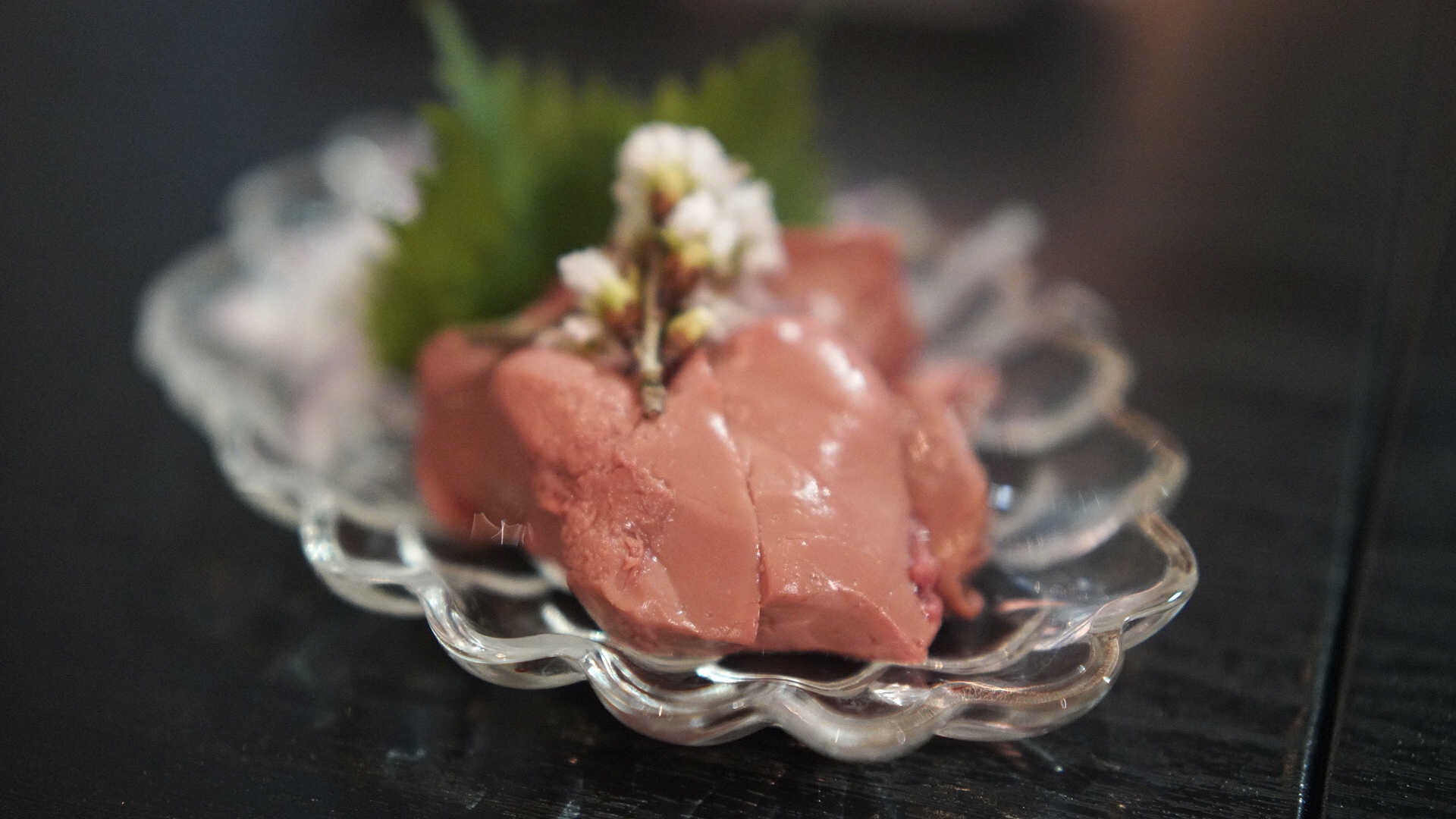 レバ刺し(580円)は低温調理がされていて食感がとろけます。