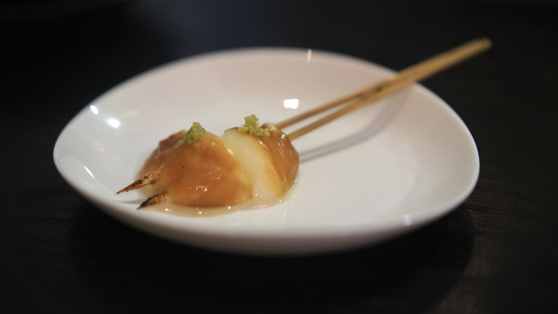 野菜串もとても丁寧で考えられています。オーダーした長芋(250円)には表面に隠し包丁が。