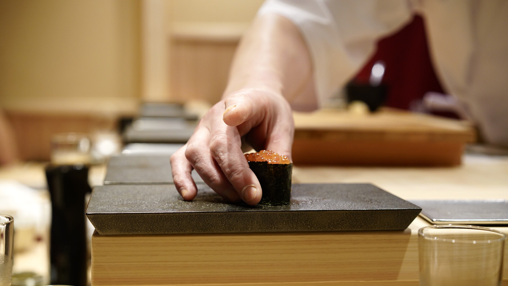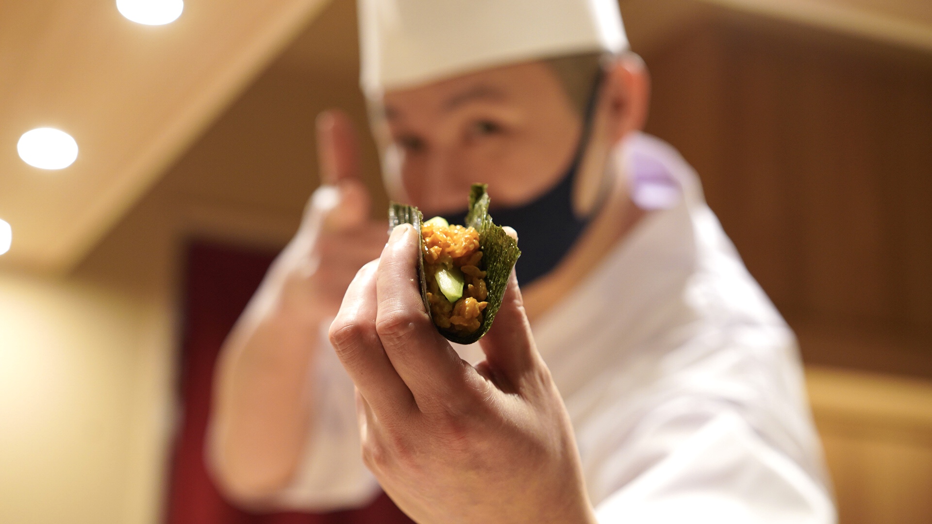 このお店のシグネチャー海苔の上に、シャリ、毛蟹、雲丹、キャビアを乗せたものここでは、スナイパー井上さんのキメポーズが撮影できます。井上さんのキャラクターがとても明るくて、元気がもらえます。若手なので、威圧感を感じず親しみやすくて話しやすい。