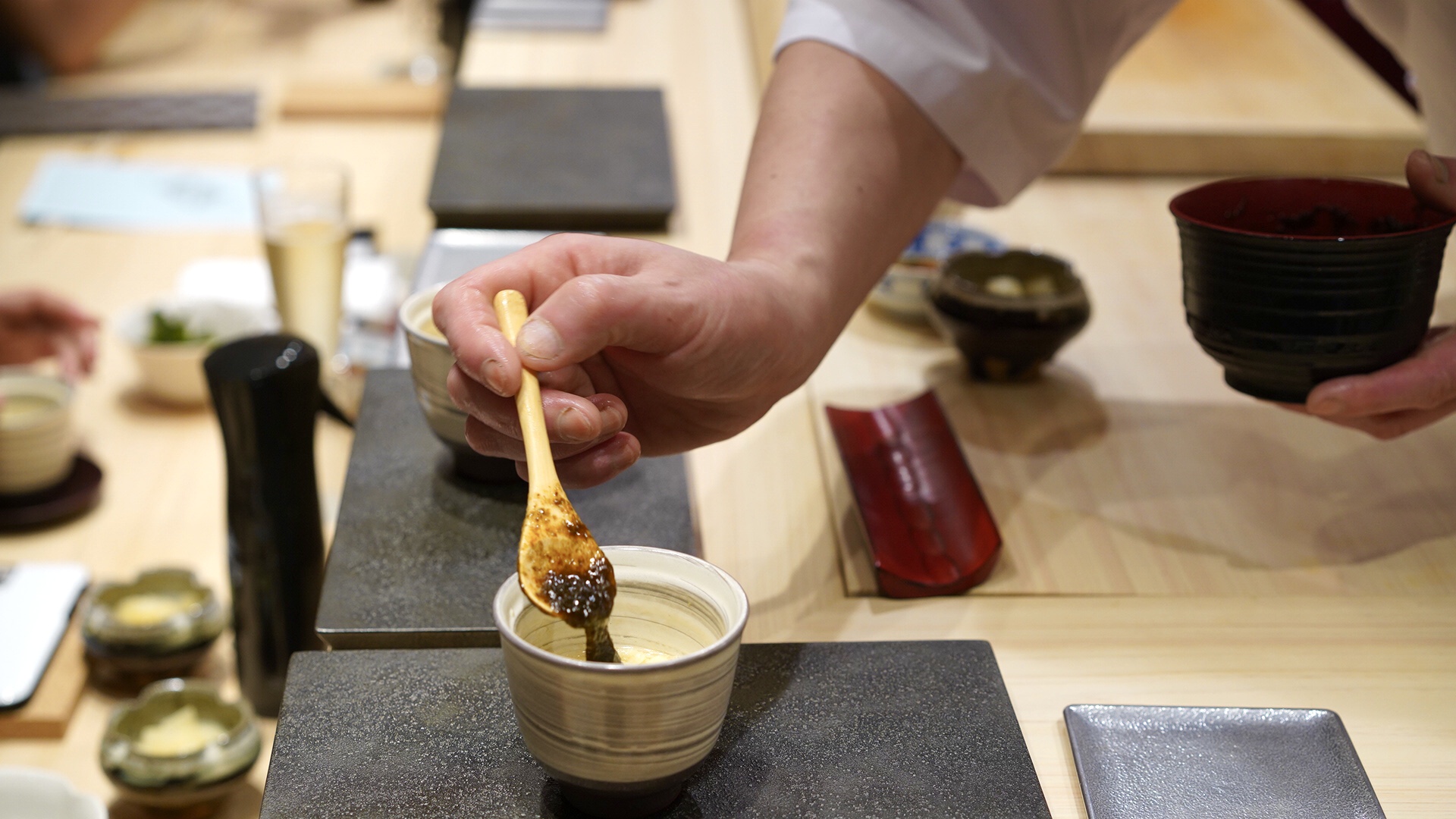 茶碗蒸しは、半分だけいただき、後半シャリ玉と自家製海苔醤油を投入し味変させます。