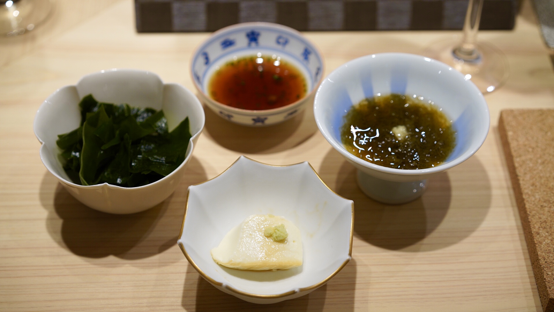 まずは、嶺岡豆腐・わかめポン酢・もずく酢のおつまみからスタートです。