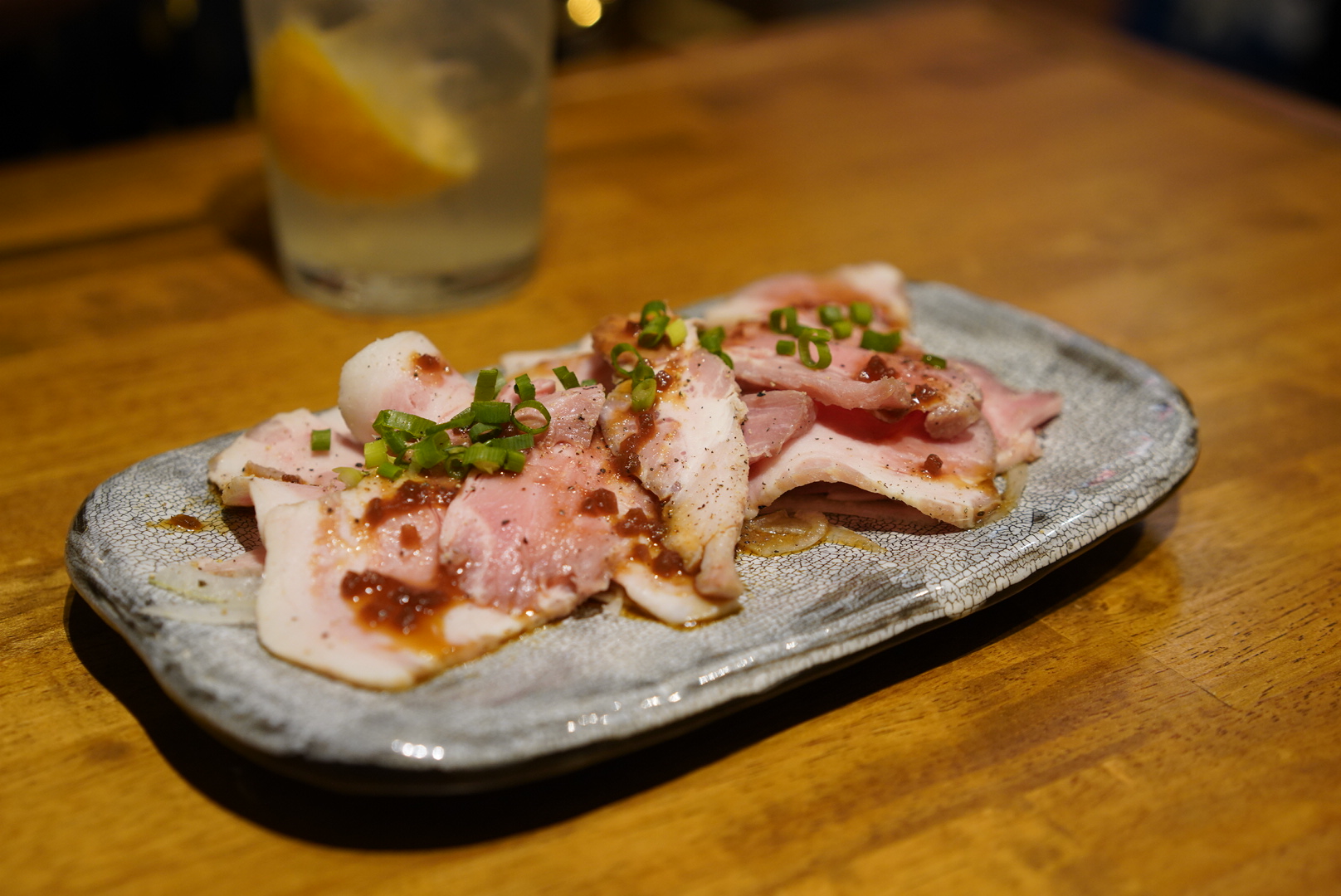 ファーストドリンクと一緒にやってきたのは、お店自慢のお通し「ローストポーク」。ガツンと来るかな?と思いきや、さっぱりとしていておいしい。ちょっぴり甘めのたれがローストポークに良く合います。