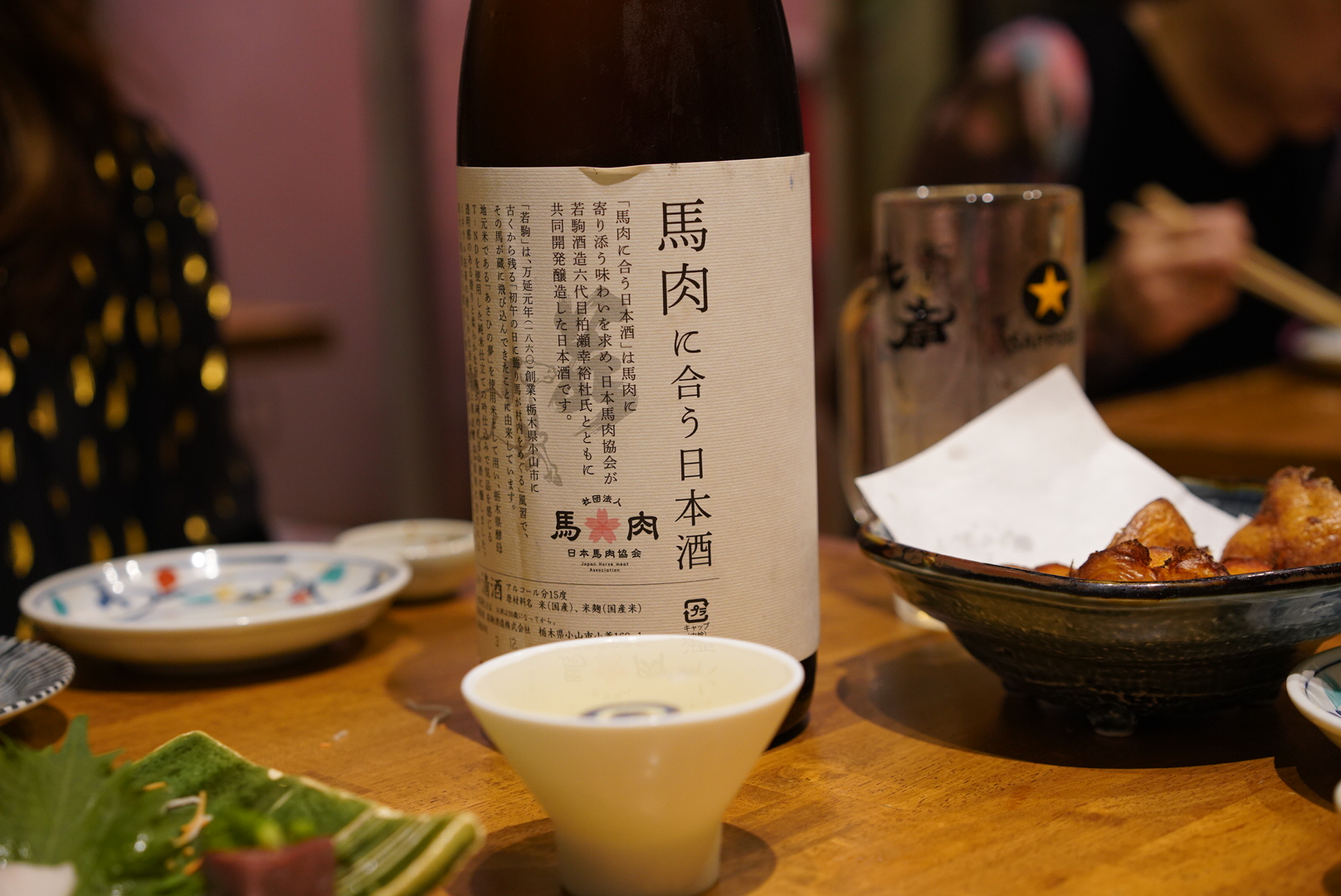 馬肉には、日本酒だよね…ということで日本馬肉協会が若駒酒造六代目柏瀬幸裕杜氏ととも に共同開発醸造した日本酒「馬肉に合う日本酒」をお願いしてみました。