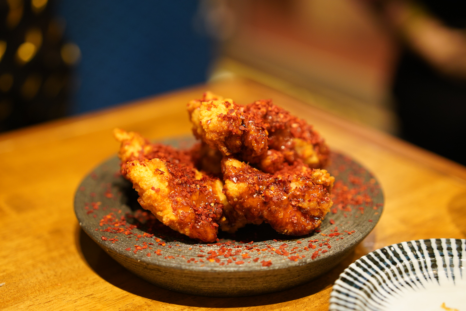 ポテトをおいしそうに食べていたら、お店の方が「鶏モモ肉の赤鬼揚げ」も人気で、おいしいですよ。とオススメしてくれたのでお願いしてみました。見た目は真っ赤でかなり辛そうですが、食べてみると意外と辛くなかったので割とどんな人でもおいしく頂けるはず。