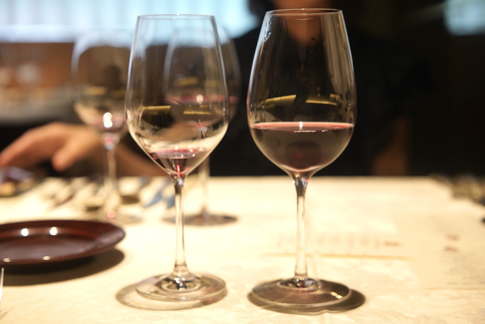 こちらのお店が有名なのは、銀座エスコフィエ時代に開発されたという楕円型のグラス「樹グラス」を使用したワインペアリングが楽しめること。以前、別のお店で出していただいたことがありその形状にびっくりしたのですが、さらに今回驚いたのが泡・白・赤とすべてのワインに適している点です。