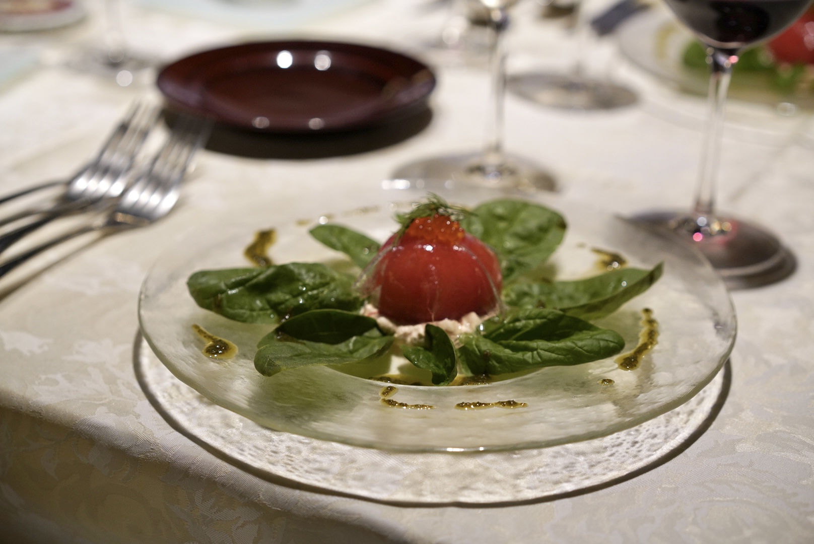 2品目は「トマトの海ノ幸のファルス」ペアリングするのは「シャンパーニュ」です。