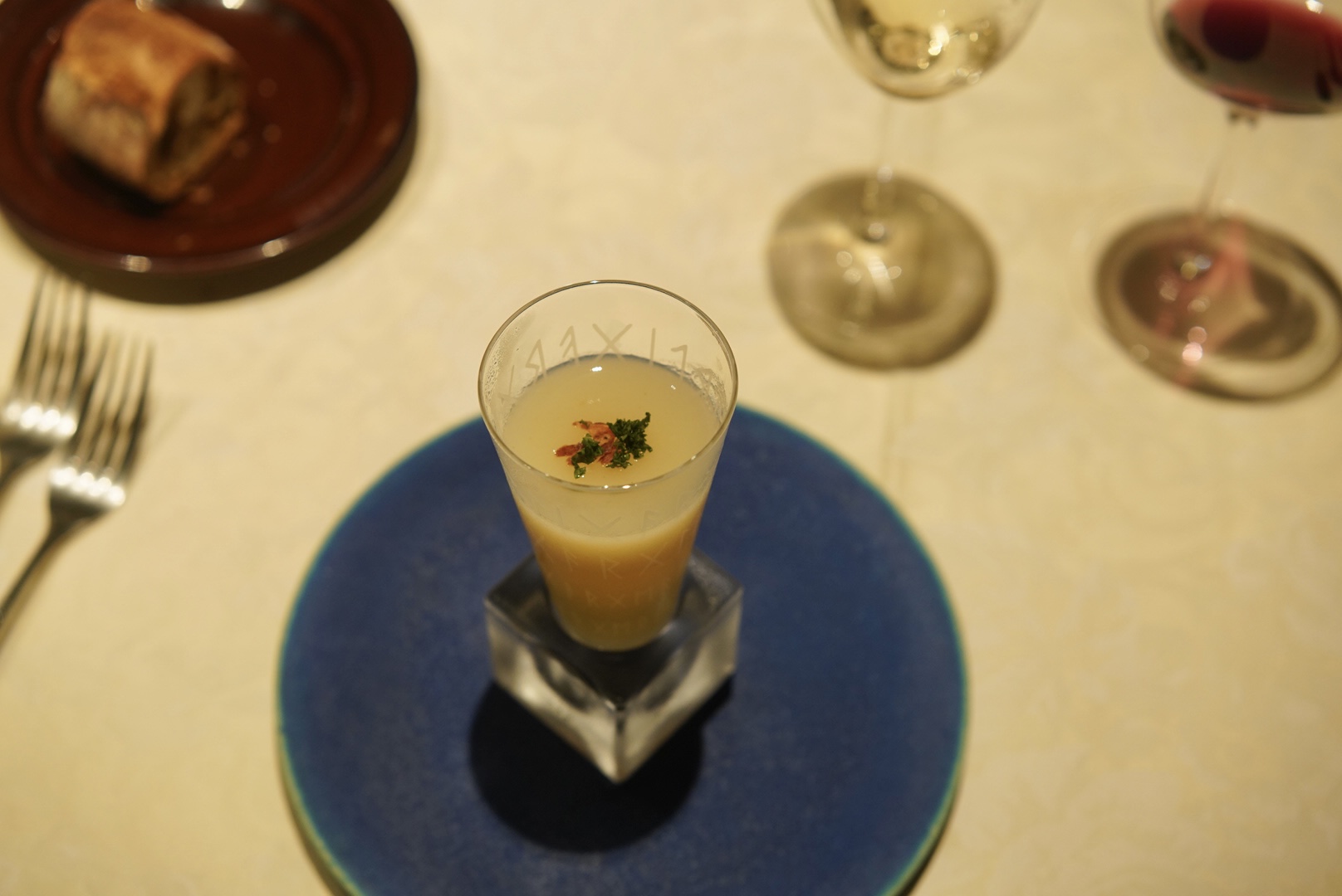 4品目は「冬瓜とコンソメのスープ(冷製)」上と下で質感の異なっていてお口直しにピッタリ。サイズ感もちょうどよくするするっと胃の中に吸い込まれていきます。