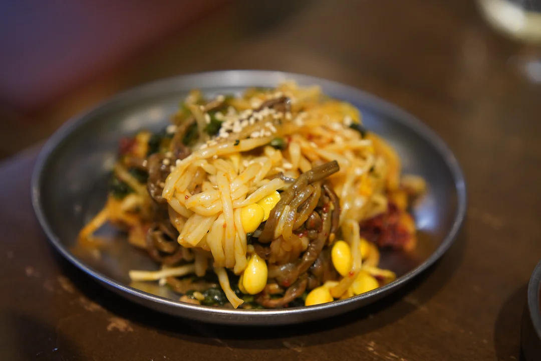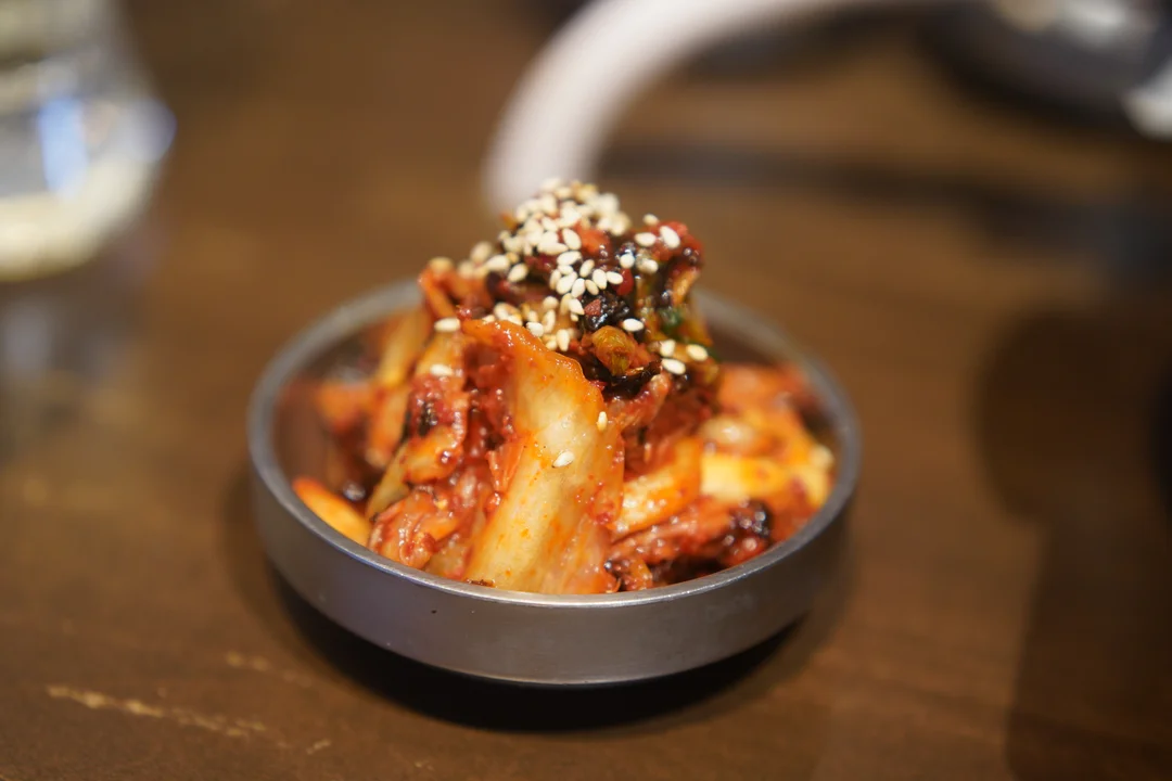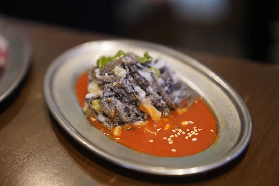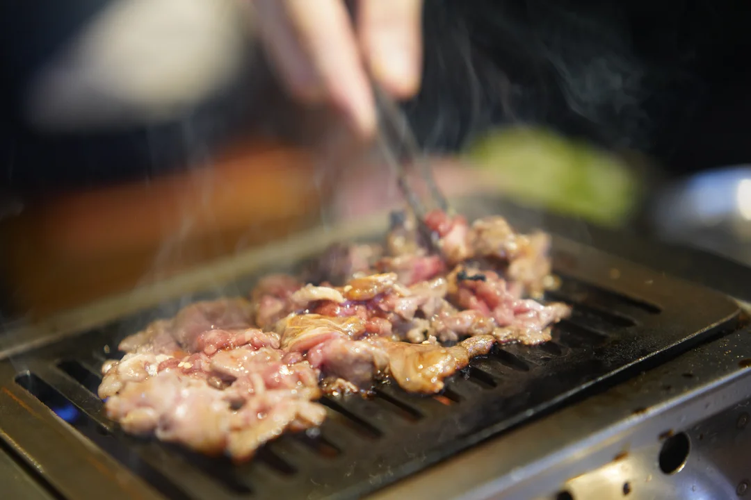 まずは「4種の混ぜナムル」と「やみつきキムチ」、「センマイ刺し」をアテにハイボールで乾杯!「黒毛和牛の絶品カルビ」は店員さんがしっかり美味しく焼いてくださるので、焼き上がりを待つだけ。黄身をつけていただくとまさに至福のひとときです。