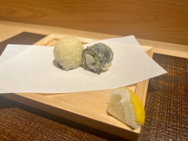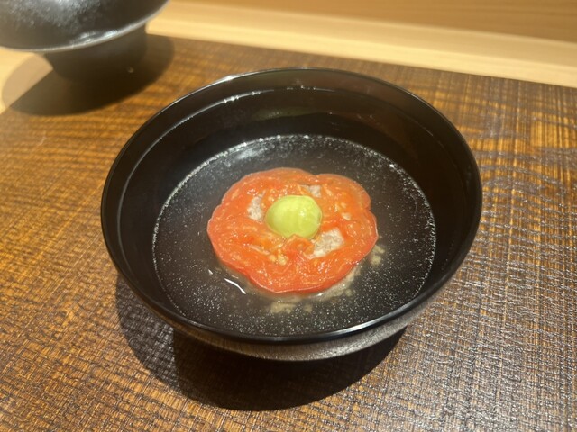 小柱の海苔巻き揚げは衣違いで2種類が楽しめ、衣が厚いほうはおかきのような食感で驚きました。貝好きとしては嬉しい一品。カナダのまぐろと茨城県久慈のたこに梅肉と翡翠ナスを合わせた一皿、甘鯛の松笠焼きはゆずの香りがふわっと広がる南京ソースで。お椀は山芋の擦りおろしにセミドライトマトを組み合わせた独創的な一碗で、箸を入れると崩れてスープに溶けだし、優しい味わいに包まれます。