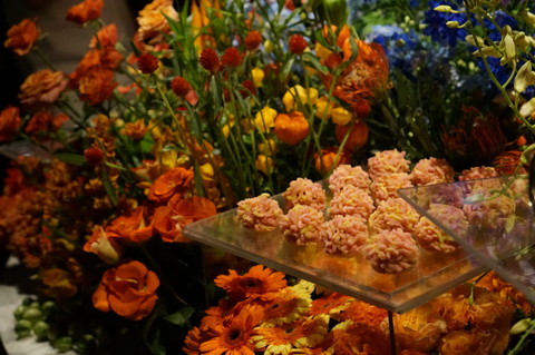 和菓子のピンチョスも、花に囲まれて華やかに。